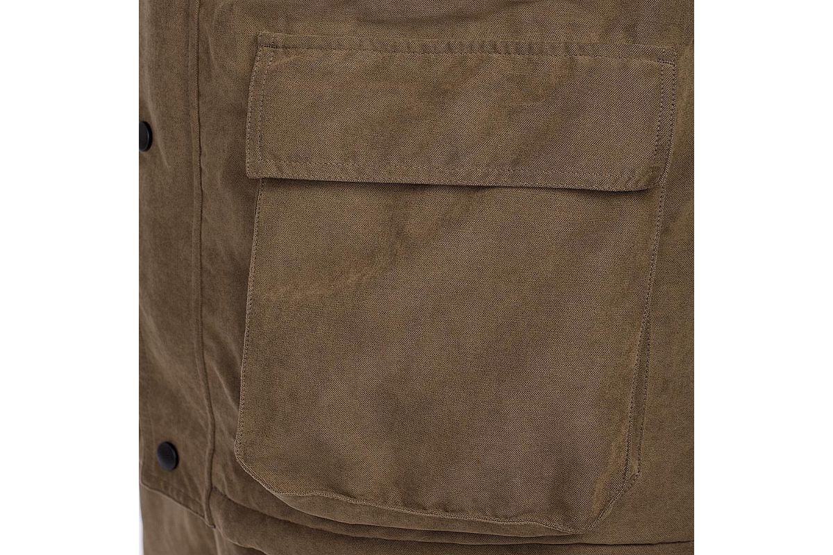 Благодаря анатомическому крою куртки и брюк костюм не стесняет движений. Нешуршащая ткань, накладка из износостойкой ткани на правом плече для лучшей прикладистости оружия, накладка на левом плече для переноски сумок, ягдташа и т. д. Два объемных кармана на куртке для дополнительного снаряжения, съемный патронташ, отделение на груди куртки для документов. Объемные карманы внутри куртки для документов или бинокля. Анатомический капюшон с возможностью регулировки. Утеплитель Termo MAX сбережет тепло в холода.