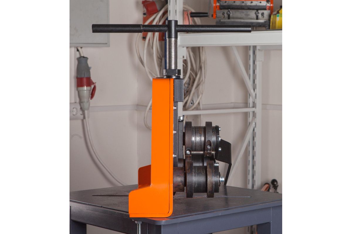 На верхнем прижимном ролике крепится рычаг (ручка) для прокатывания заготовок. Толщина стенки профильной и круглой трубы 1.5-2 мм.