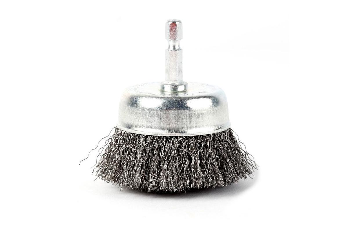 чашеобразная проволочная щетка для дрели, предназначена для снятия лака, краски, зачистки ржавчины. Наружный диаметр 65мм, вал шестигранник,гофрированная проволока