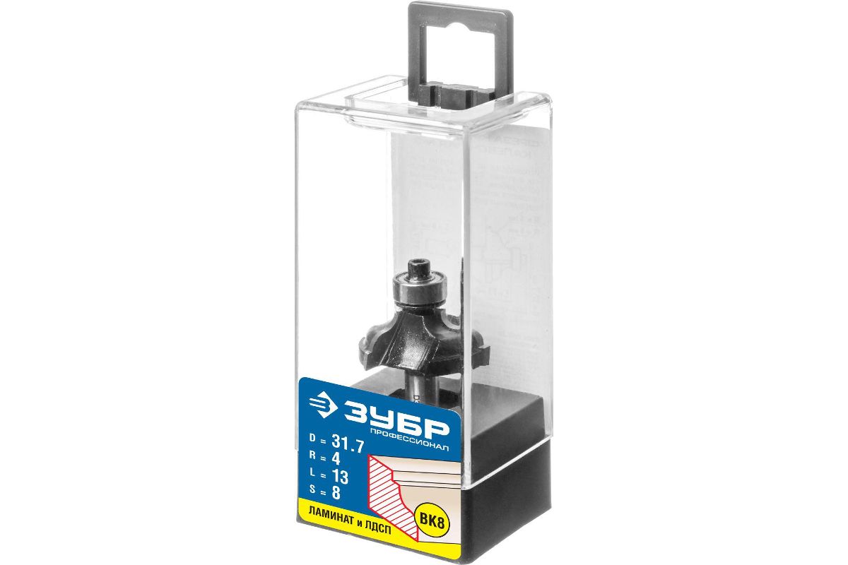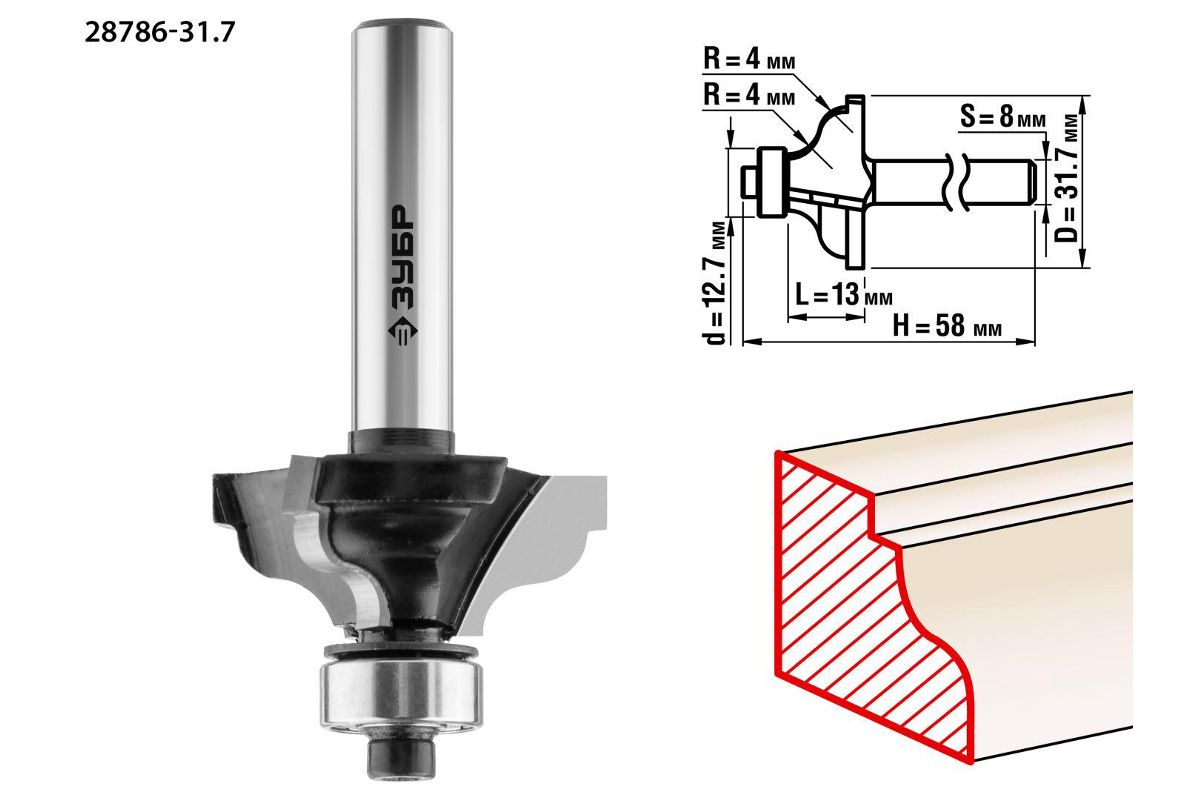 Фреза ЗУБР ''ПРОФЕССИОНАЛ'' кромочная калевочная №3, диаметр-31.7 мм, рабочая длина-13 мм, радиус-4 мм, хвостовик-8 мм, диаметр подшипника-12,7 мм