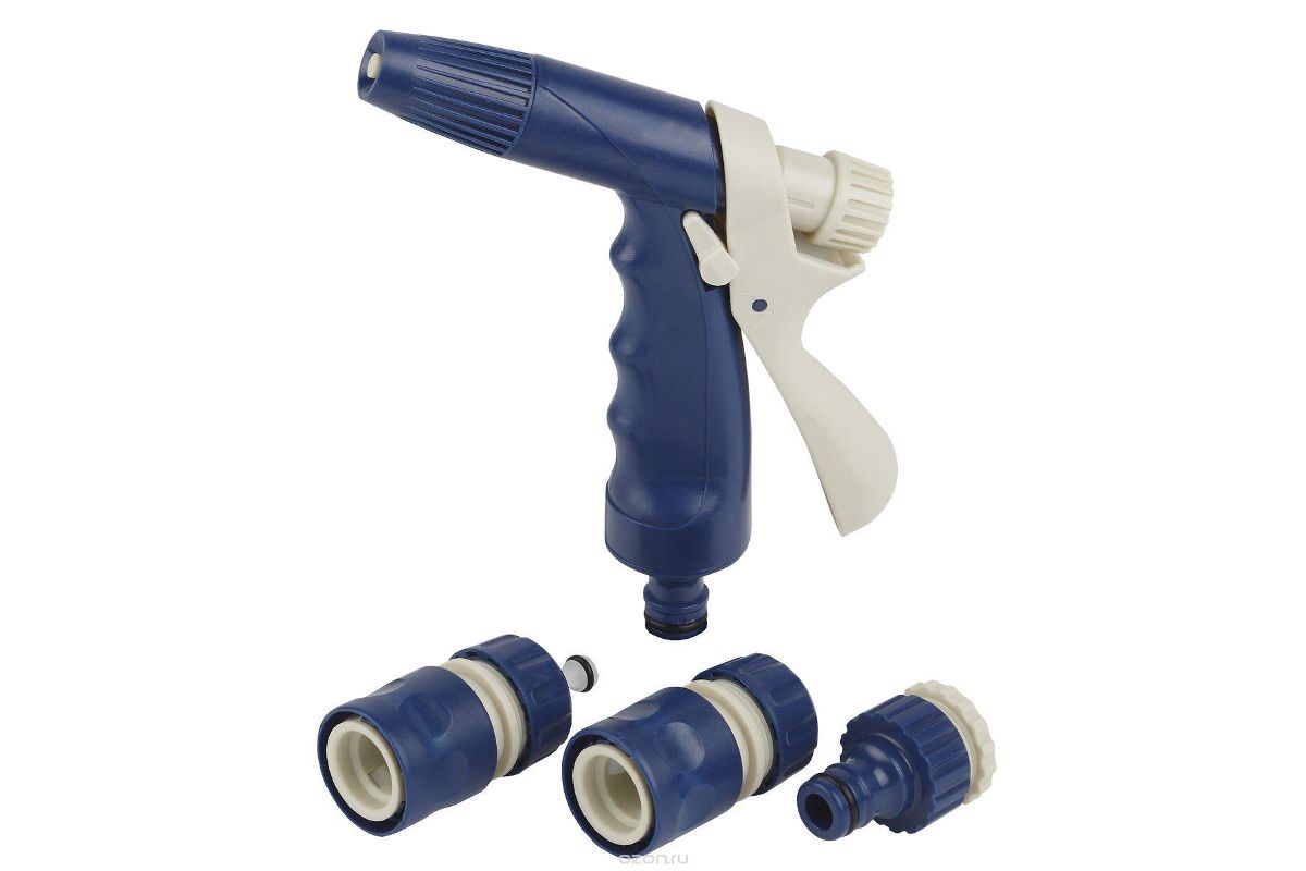 Комплект для полива состоит из пистолета-распылителя, коннекторов и штуцера. Используется для подключения к шлангу или к водопроводу с резьбой 1/2'' или 3/4''.