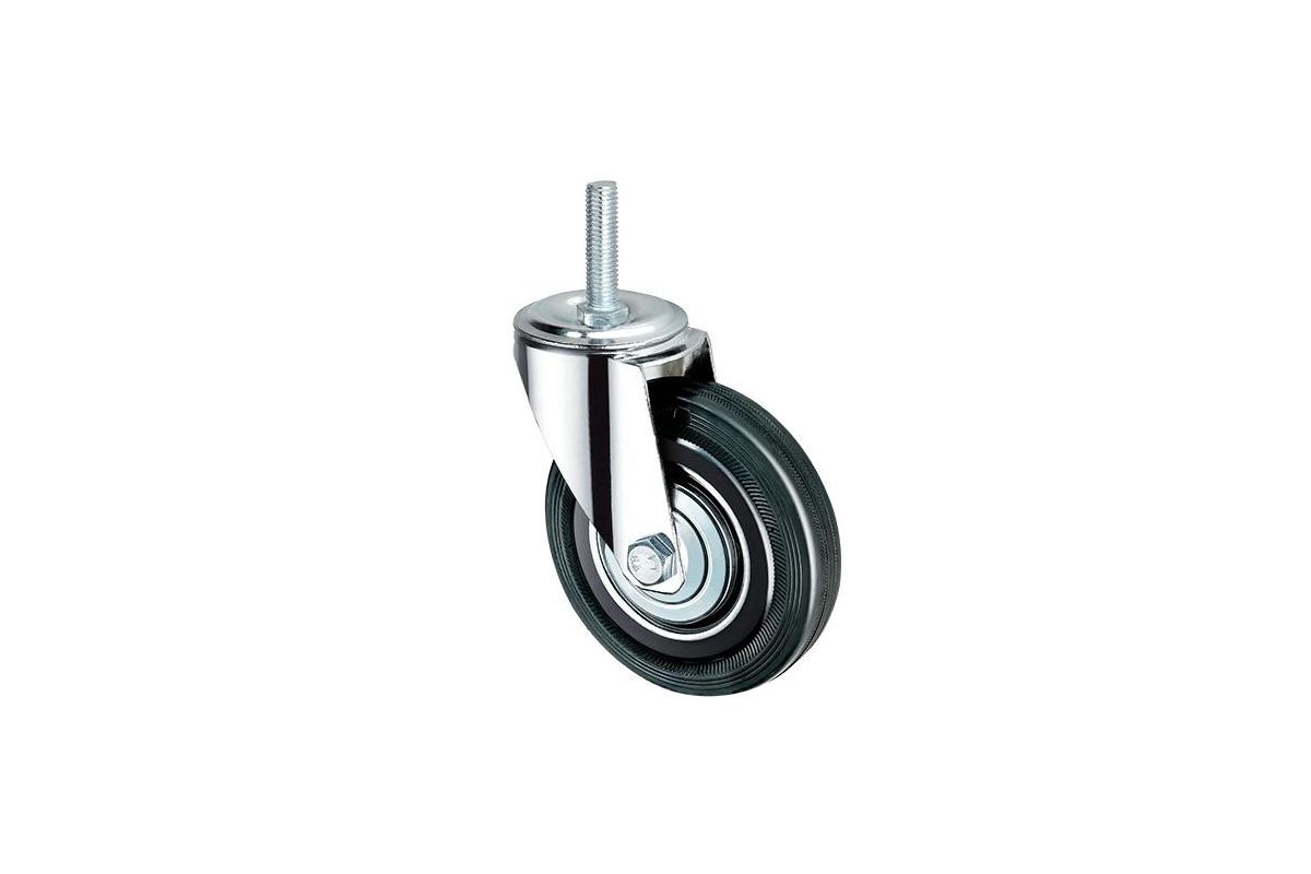 Колесо с поворотным кронштейном с болтовым креплением на литой черной резине отлично амортизирует вибрации и удары. Подходит для использования в помещении и на улице. Высокая механическая прочность достигнута путем нанесения цинкового слоя на сталь, из которой изготовлен обод и кронштейн. Цинк улучшает стойкость листа к механическим нагрузкам и абразивному износу. Обод закрыт стальными дисками, которые препятствуют проникновению внутрь колеса влаги и различных загрязнителей. В оси колеса установлен роликовый (игольчатый подшипник. Обладает рядом преимуществ: способен выдерживать значительные нагрузки, обеспечивает плавность хода и увеличивает срок эксплуатации. В поворотном узле установлен двухрядный шариковый подшипник, отвечающий за маневренность в движении.