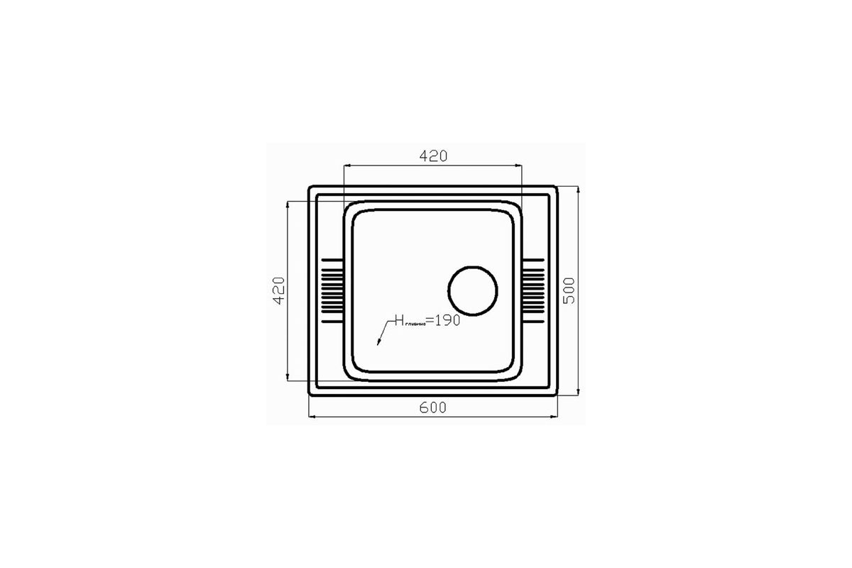 Внешний размер мойки: длина 600 мм, ширина 500 мм.